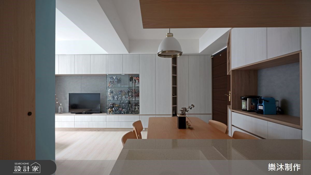 一進門玄關櫃藉由斜面的轉折,串聯起收納機能充沛的電視櫃,延伸出溫暖的視覺重點,而靠窗處則採取輕巧的拉門形式,為櫃體帶來多元的使用情境,收納外出的衣物、包包都很適宜。此外,屋主本身有收藏各種公仔的喜好,因此設計師也規劃了透明玻璃櫃,展示大大小小的鋼彈、變形金剛等模型,打造出有趣的公領域亮點。