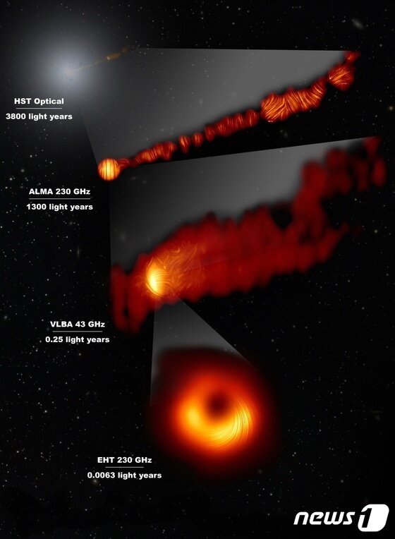 이어“M87 블랙홀 주변의 뜨거운 가스 일부는 가장자리의 강한 자기장의 압력으로 블랙홀 중심의 강한 중력에너지를 이기고 밖으로 밀려 멀리 제트의 형태로 날아간다”라며 “나머지 일부는 자기장에 끌려 사건의 지평선으로 나선운동하며 떨어진다”고 설명했다.