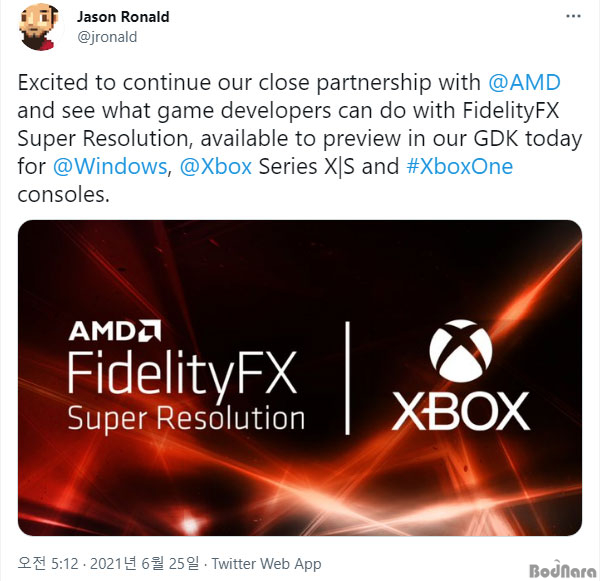 AMD가 시스템 요구 성능이 높은 타이틀의 성능 보완을 위해 활용할 수 있는 업스케일 기능인 피텔리티FX 슈퍼 레졸루션(FSR)을 발표한지 약 사흘이 지난 현재, 마이크로소프트의 엑스박스 시리즈용 게임 개발자 킷에 해당 기능이 업데이트될 것이란 소식이 전해졌다.