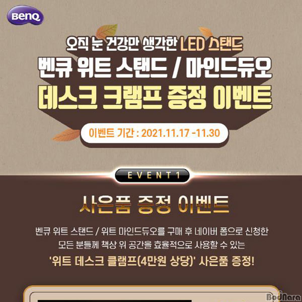 이번 이벤트는 11월 17일부터 11월 30일까지 11번가, 지마켓, 옥션 등의 온라인 오픈마켓과 네이버 브랜드스토어 등에서 위트스탠드, 마인드듀오를 구입한 모든 고객들에게 책상 공간을 효율적으로 사용할 수 있는 위트 데스크 클램프를 증정하고, 벤큐 브랜드 스토어를 제외한 온라인 몰에서 위트지니를 구입한 고객을 대상으로는 신세계 상품권을 증정한다. 또한, 위트 스탠드 시리즈 (위트스탠드, 마인드듀오, 위트지니)를 구입하고 사진을 포함한 구매후기를 작성한 모든 분들에게 모바일 문화상품권(1만원권)을 추가로 증정한다.